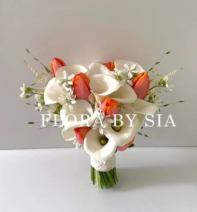W-116 부케는 우아한 화이트 카라, 화사한느낌의 오렌지 튤립, 아스틸베를 믹스한 부케입니다.