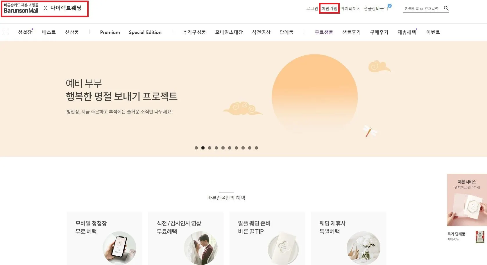 1) 바른손카드 다이렉트 전용몰에 접속하여 회원 가입해주세요.