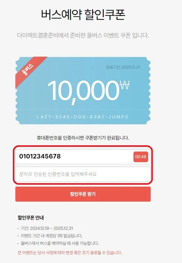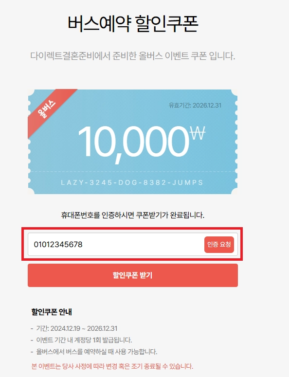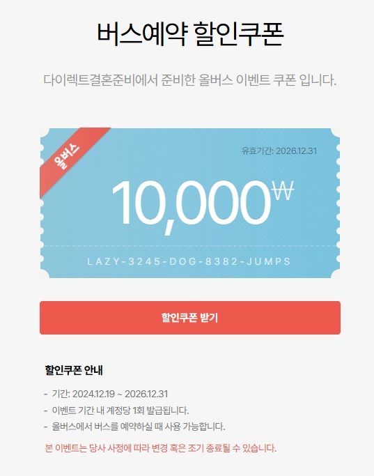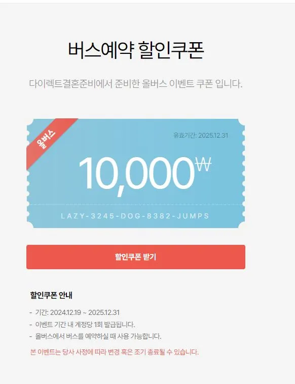 쿠폰 다운로드 페이지 접속 : https://allbus.kr/campaigns/873347112/?referrer=directwedding