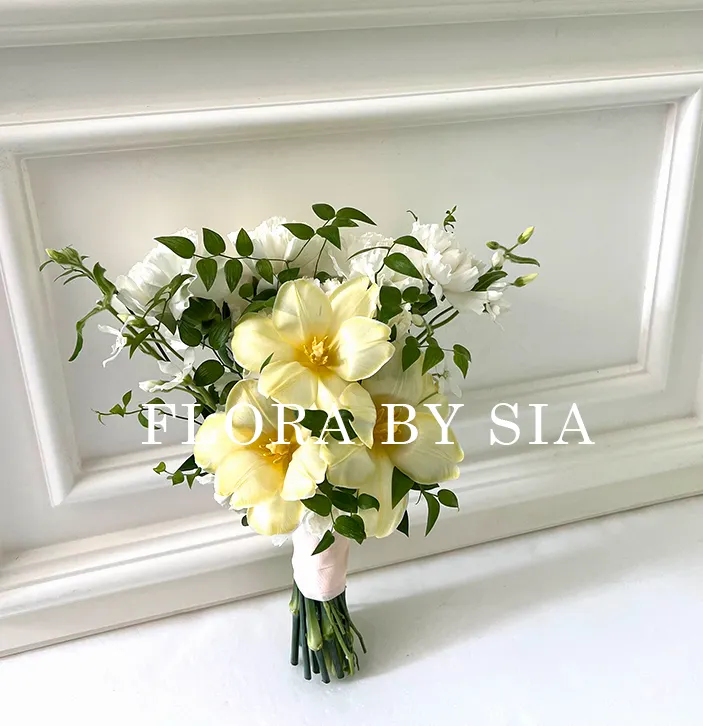 NS-655 부케는 화이트 카네이션으로 형태를 잡고 옐로우톤의 튤립으로 포인트를 준 부케입니다.