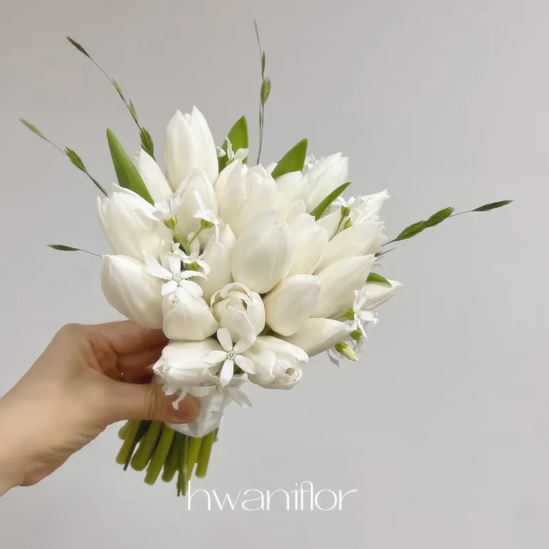 C-01 화이트 튤립 부케는 맑고 깨끗한 이미지의 화이트 튤립을 메인으로 제작한 부케입니다. (추가금+3만)
