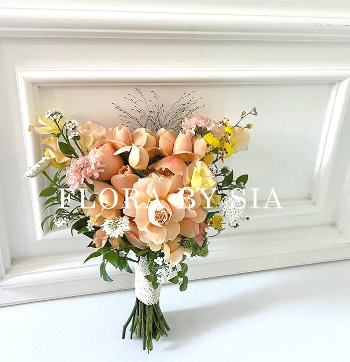 W-303 부케는 피치톤의 일본수입장미와 옐로우잔꽃 그린소재모두 수입소재로 제작된 부케입니다