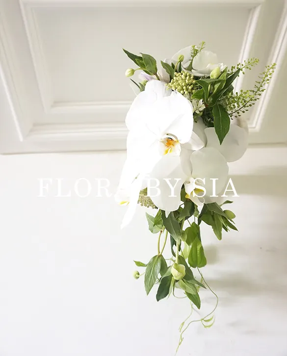 W-337 부케는 화이트호접 그린헬레브루스 등으로 제작된 케스케이드 스타일의 부케입니다.