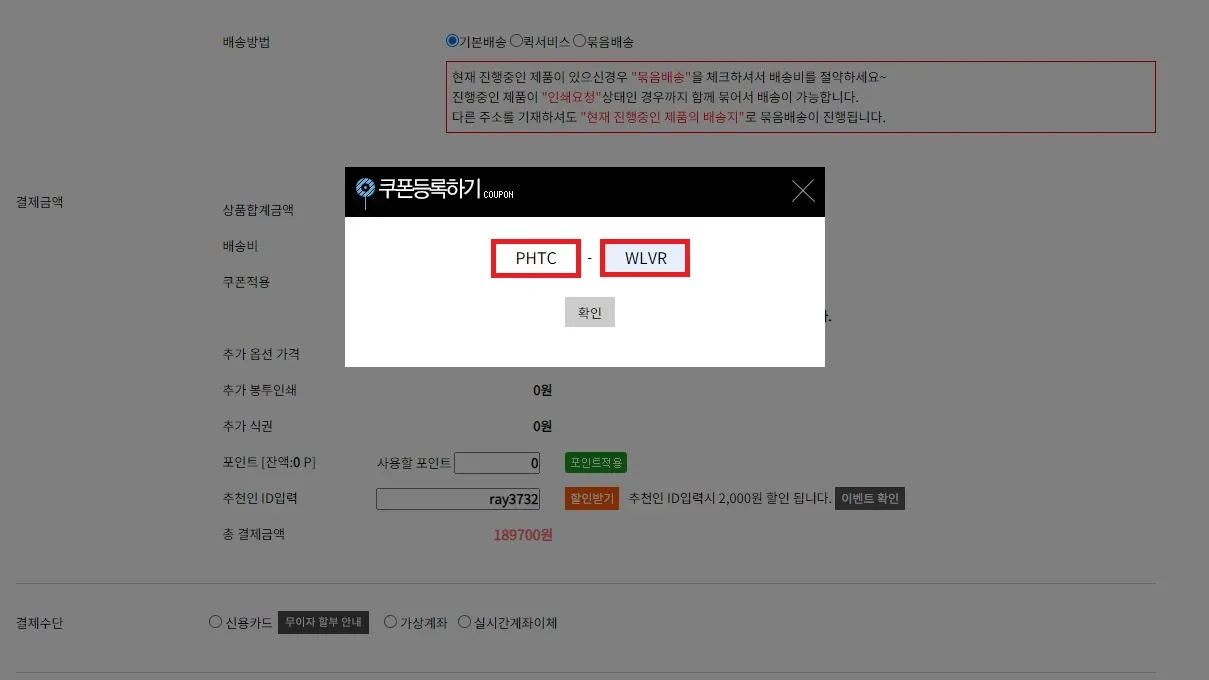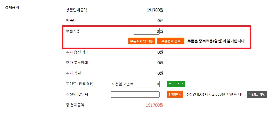 5) 최종결제단계에서 쿠폰번호 등록 → 쿠폰번호를 등록하여 쿠폰을 적용해주세요