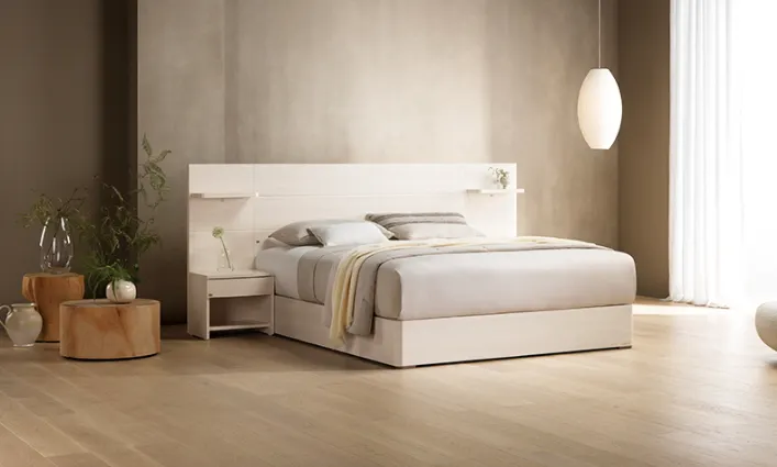 넓고 웅장한 헤드보드와 패널 구성으로 신혼집 침실에 고급스러운 호텔 분위기를 연출할 수 있습니다.