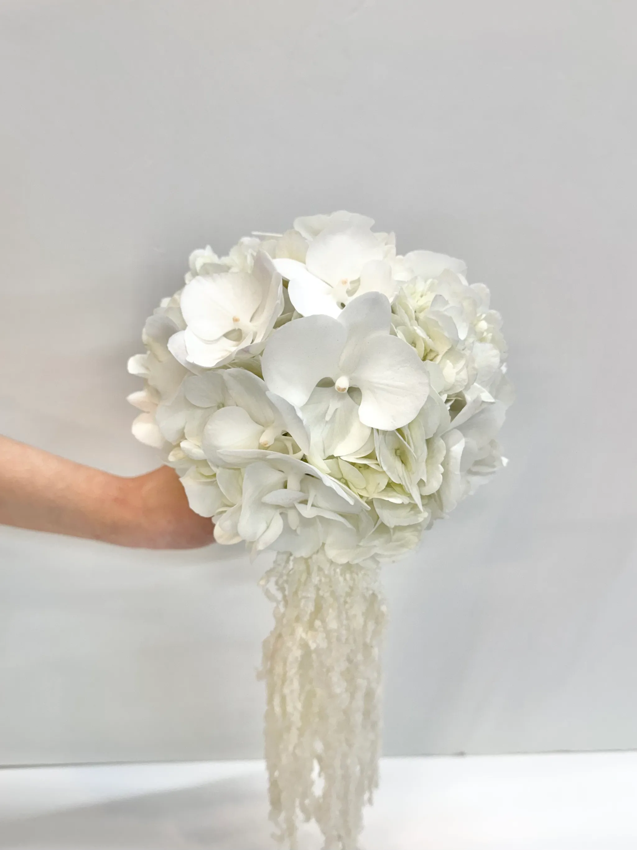 NS-133 부케는 화이트수국, 백조호접, 화이트맨드라미(프리저버드) 화이트꽃들로만 이루어진 부케로 고급스러운 느낌을 원하시는 신부님들께 추천드립니다