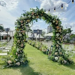 웅장한 공간 속 조명을 받을 때 더욱 빛날 수 있는 그린앤화이트 또는 피치톤 부케를 고려해보시고, 풍성한 느낌을 주는 소재의 꽃이나 통통한 형태의 둥근 라운드형 부케를 추천합니다!