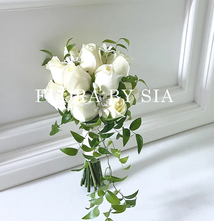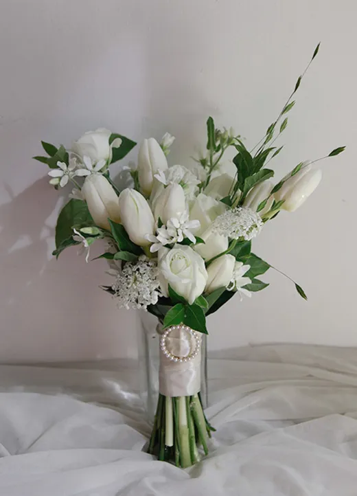 깨끗하고 순수한 컬러인 화이트꽃이 메인소재인 부케를 추천합니다.