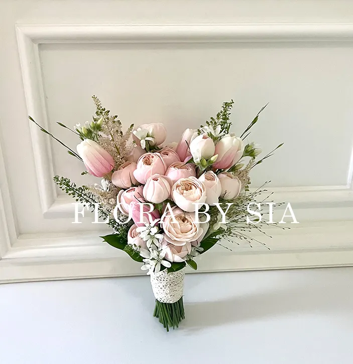 W-265 부케는 맨스필드파크장미와 그라데이션 튤립 및 연핑크아스틸베를 믹스한 부케입니다.