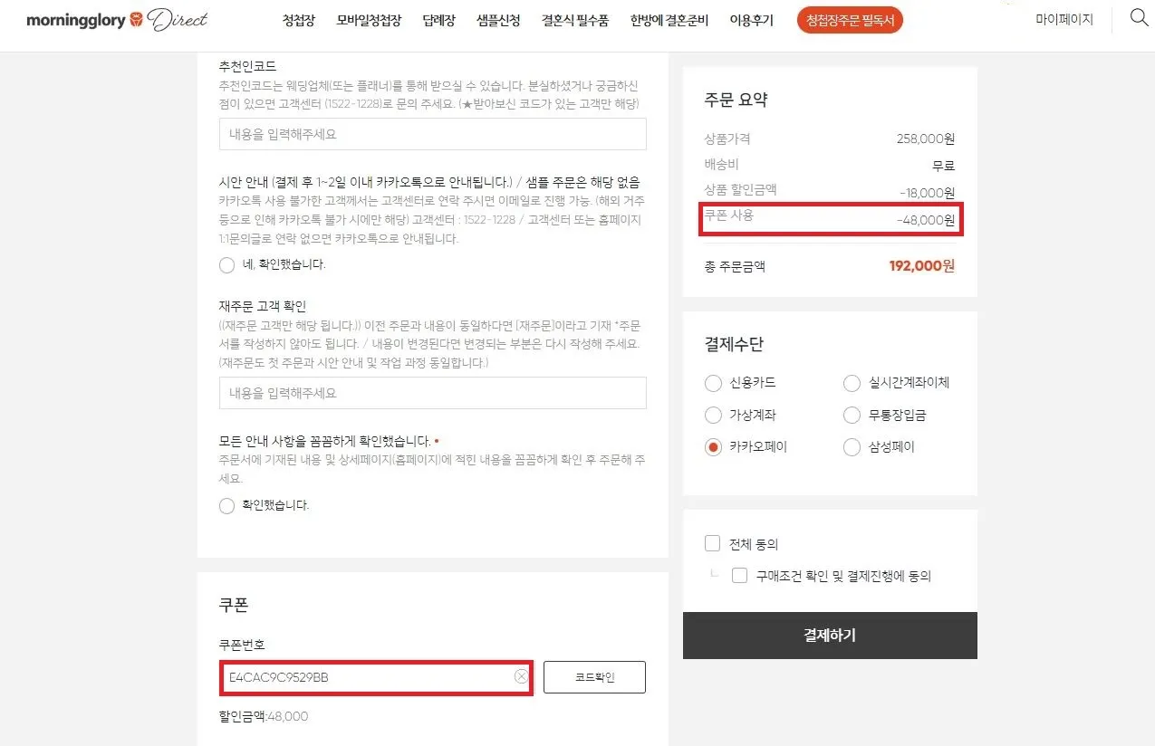 청첩장 주문결제화면 최하단에 쿠폰번호를 입력한 후 ‘쿠폰확인’을 누르면 20% 즉시할인이 자동 적용됩니다.