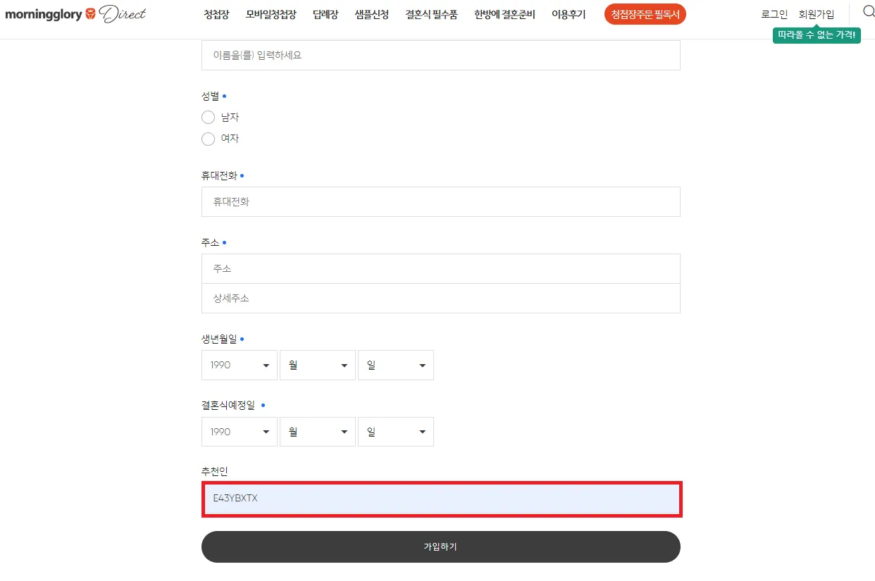 추천인 코드 입력 시 무료 식전영상 제작 쿠폰을 지급해드립니다 (종이청첩장 주문 시)