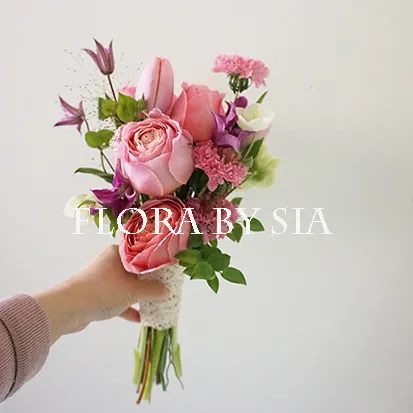 W-344 부케는 로맨틱앤틱로즈와 연핑크튤립 및 클레마티스 등 고급수입꽃들을 믹스한 모델입니다